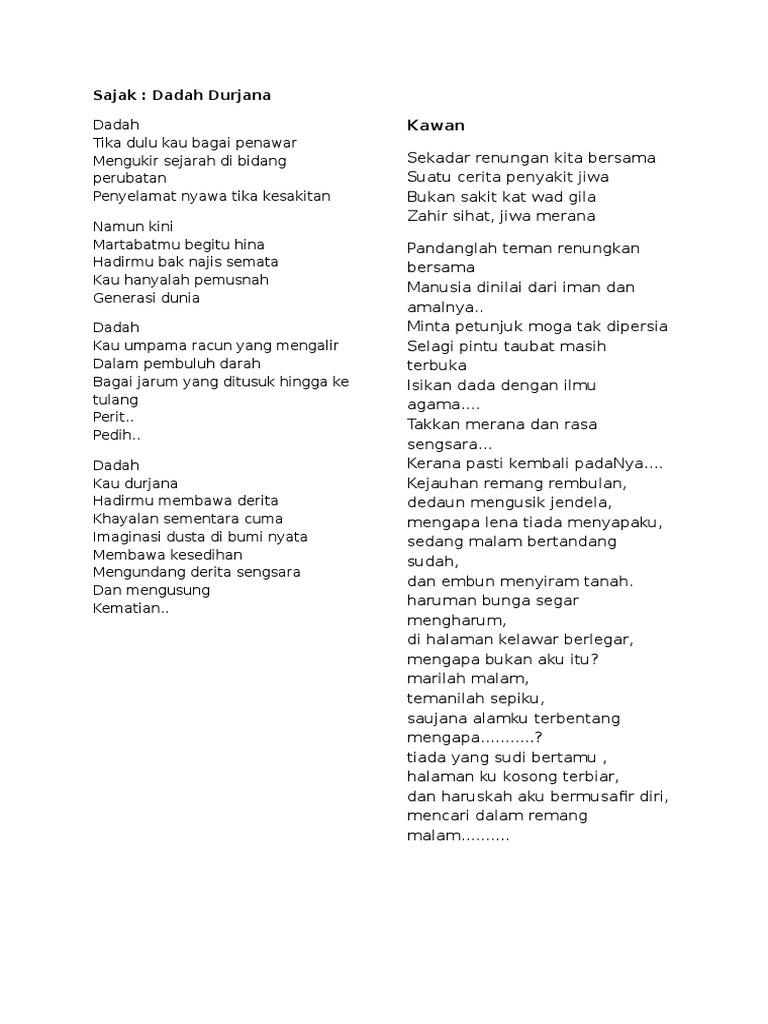 SAJAK DADAH tiktiktik waktu terus berdetik ragam manusia satu demi satu tercipta kulihat dua manusia berkongsi pentas yang sama tapi lakonan watak berbeza satu jalannya gah rapi sekali berk0t hitam mendabik dada aduh bangga persis telah diukir diwajahnya aku lepasan pusat pengajian tinggi aku manusia berkerjaya tapi yang di sana pula aduh sedih mengapa langkah. Oleh Dato Usman Awang. KETAATAN DAN KEBERANIAN Berjanjilah kami demi keberanian melalui suara-suara hijaz putaran kemerdekaan menyusur sungai-sungai mati kepada insan seikat masyarakat yang telah bebas.